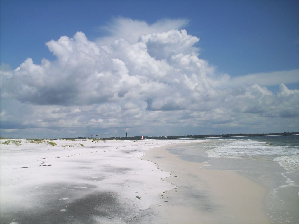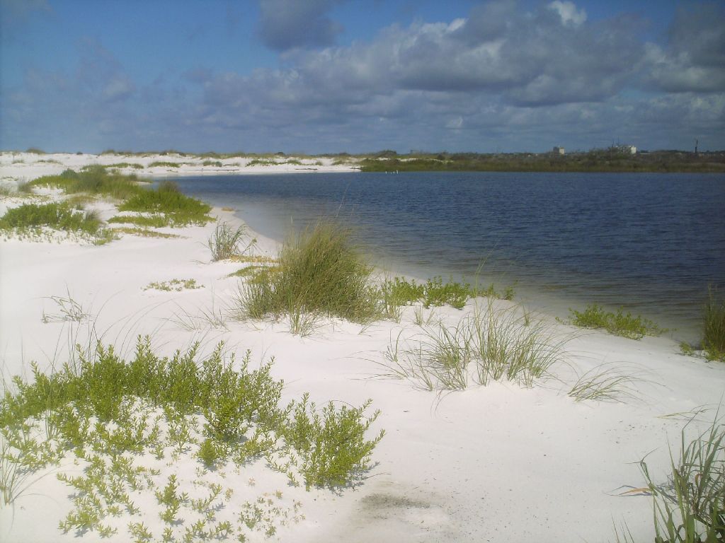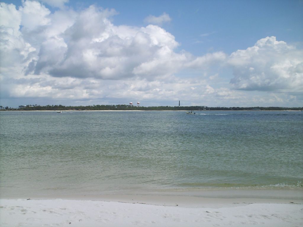 The eastern tip of Perdido Key Island, overlooking mainland Florida. See the Pensacola lighthouse in the distance.