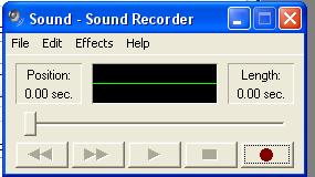 Pull up Sound Recorder. To do so, click Start, click Programs (or All Programs), then click Accessories. Click Entertainment, and finally click on Sound Recorder. It should look like this: